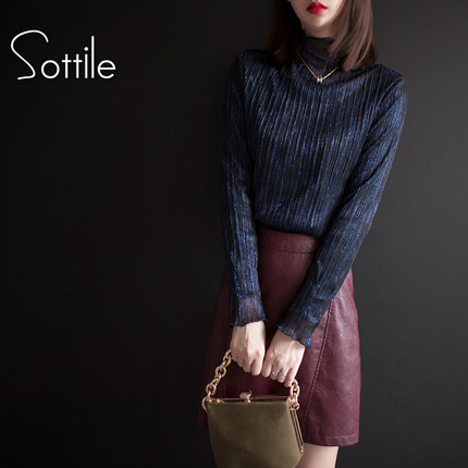 2018秋冬新款韩版亮丝网纱加绒打底衫长袖女闪光丝蕾丝上衣雪纺衫